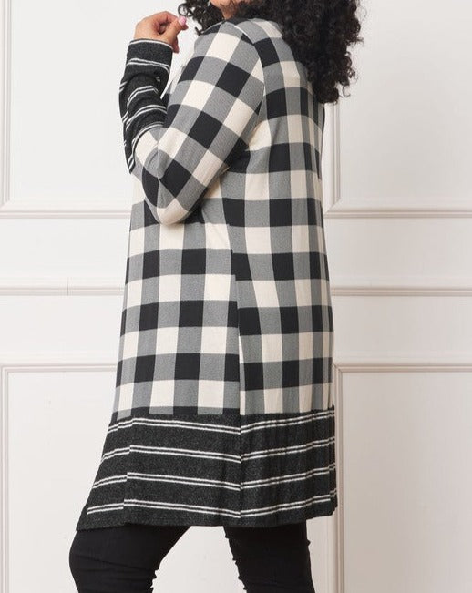 ELLICE LONG BUFFALO PLAID STRIPE TRIM CARDIGAN (PLUS)