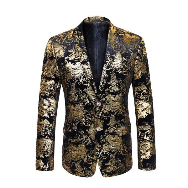This dress jacket features single-breasted, notched lapel, center vent, one button closure, hot stamping printing process.